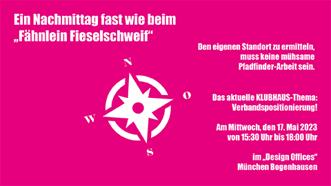 Das KLUBHAUS der Verbände startet am 17. Mai von 15.30 bis 18.30 Uhr in München mit dem Thema „Positionierung“ eines Verbandes. Mit diesem neuen Format wollen wir eine Plattform schaffen, um in inspirierender Atmosphäre den Erfahrungsaustausch zwischen Verbandsmanagerinnen und Verbandsmanagern zu einem bestimmten Thema zu fördern und dieses mit Impulsen anzureichern.